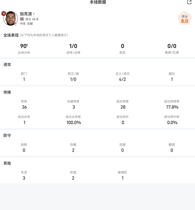 加克波战切尔西全场数据:打进1球,传球成功率77.8%